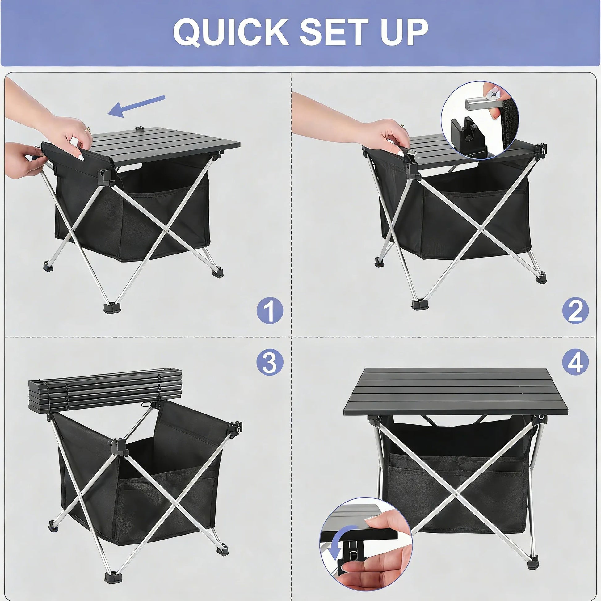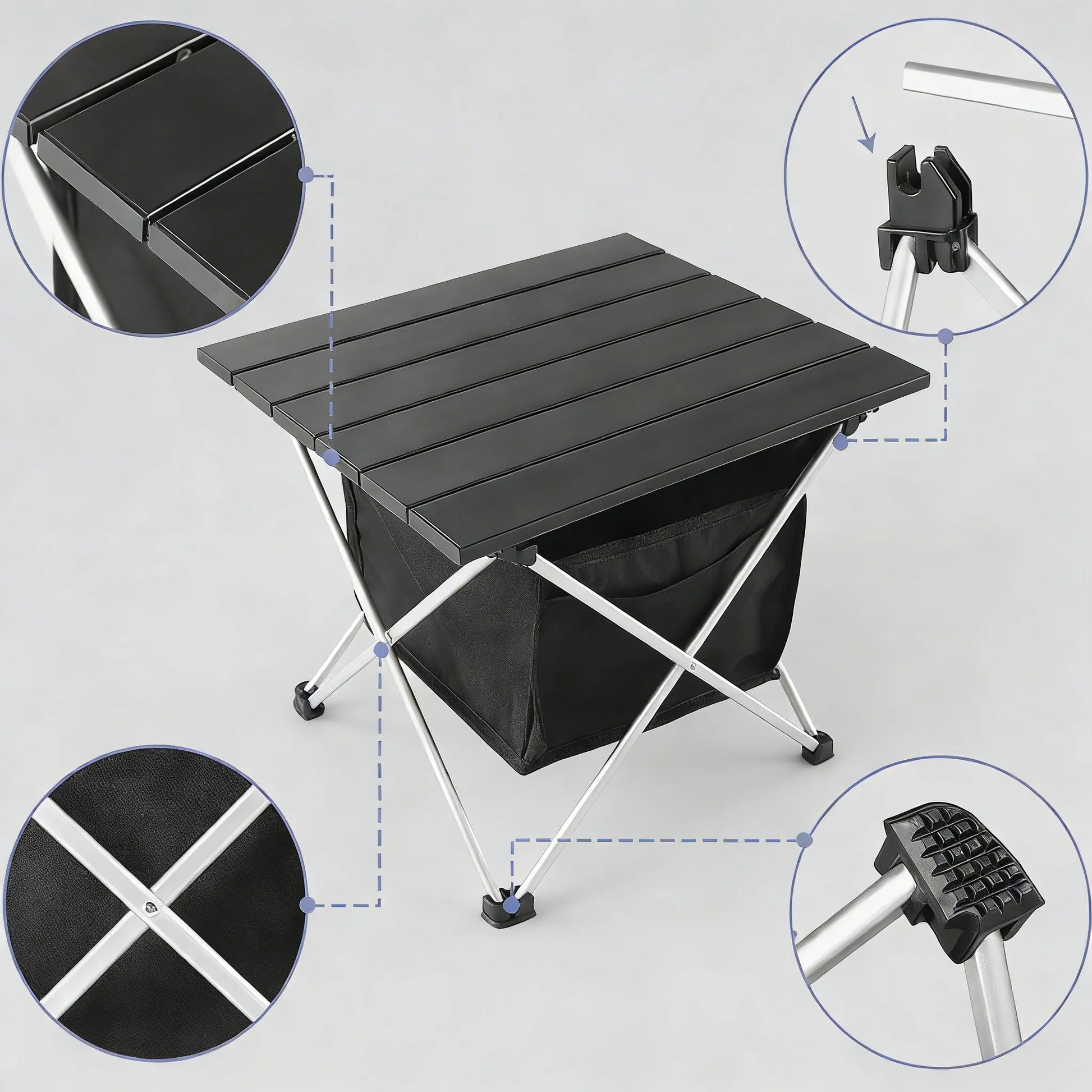 Sturdy and Durable Build – Our folding camping table is constructed with heavy-duty aluminum. Legs are secured with stable foot caps to prevent folding, bending, or coming loose, allowing safe use on varied terrain without tipping. The triangular frame and reinforced joints support up to 55 lbs, giving you confidence during picnics or outdoor cooking.